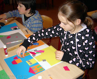 - Knip rechthoeken van papier en/of ribkarton in verschillende groottes en kleuren → de huizen.